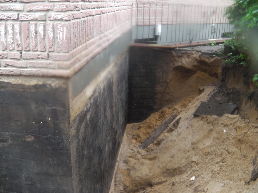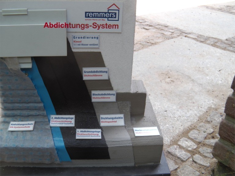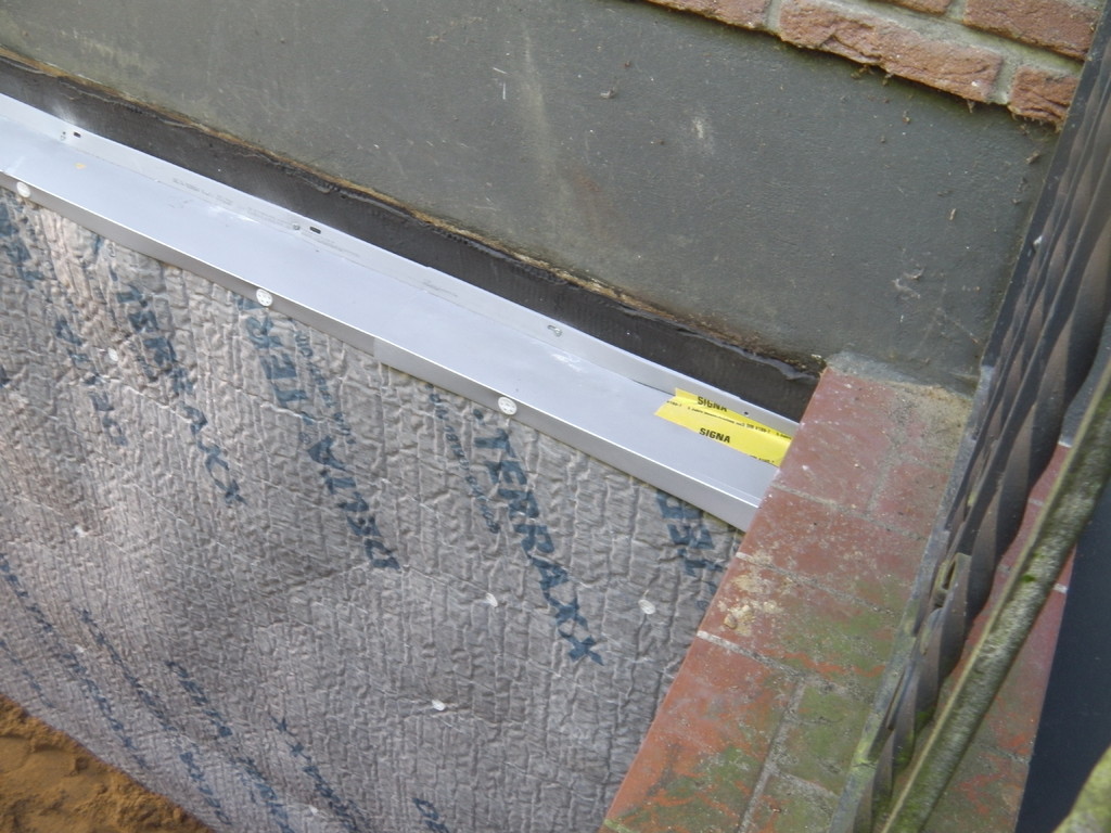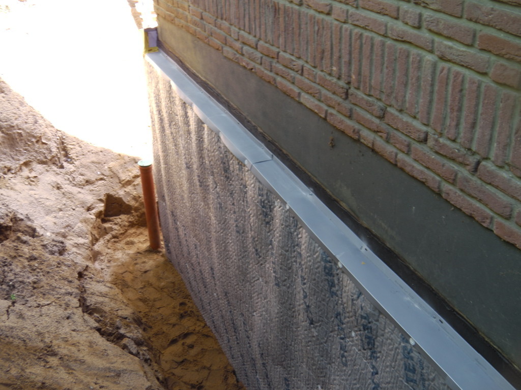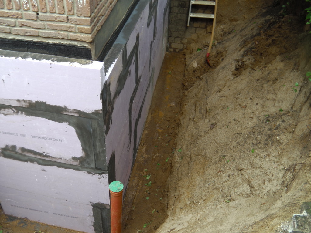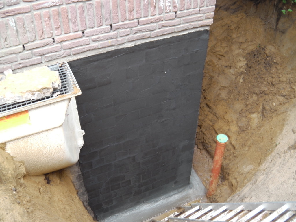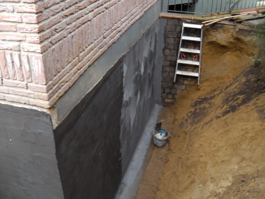 Nachträgliche Kelleraußenabdichtung gegen von außen drückendes Wasser & aufstauendes Sickerwasser auf behandeltem Mauerwerk, mit beschädigter bituminöser Abdichtung